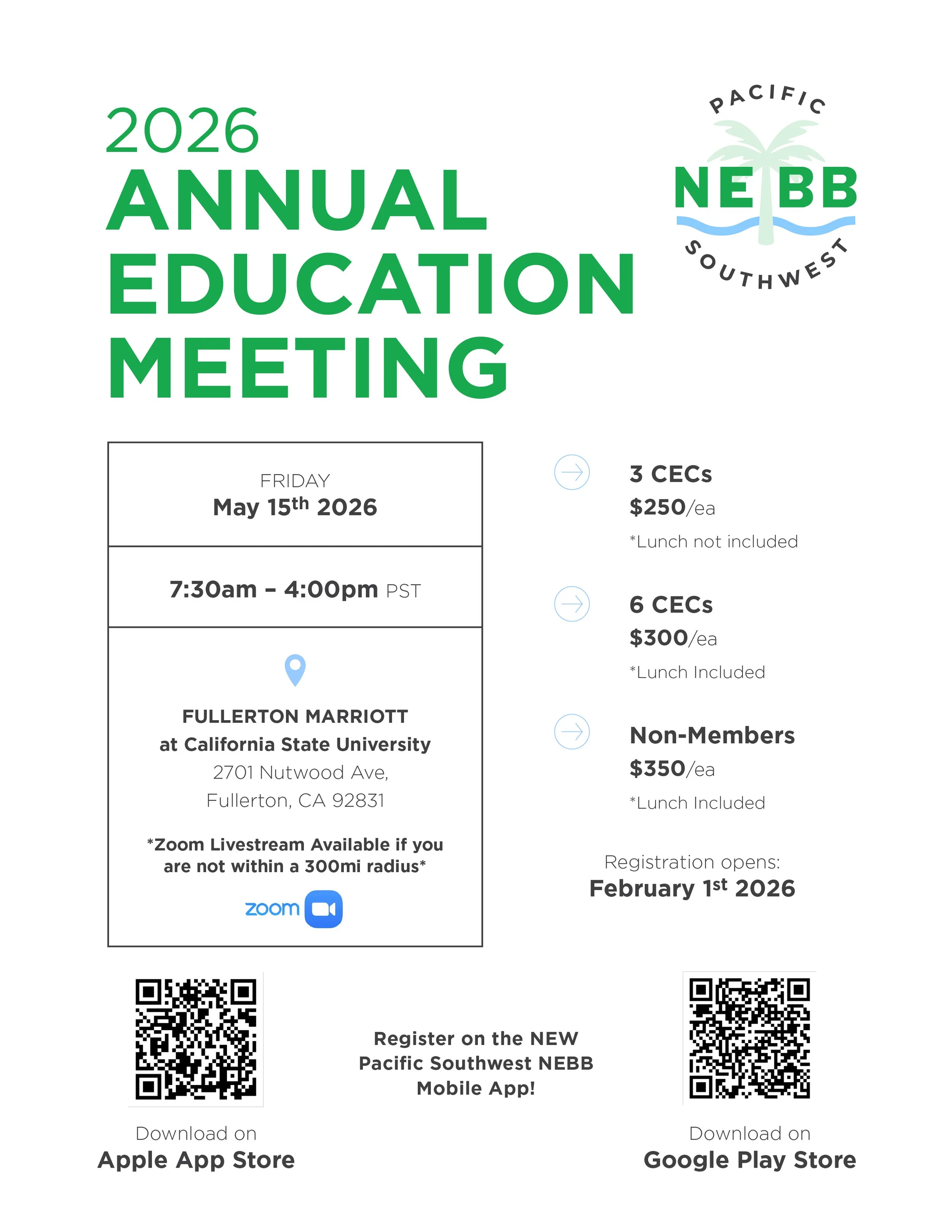 If interested in attending the rebroadcast, please reach out to Jim Rosier at Pacificswchapter@nebb.org for cost.